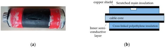 The three-core XLPE cables were separated and transformed into single-core cables to replicate three typical insulation defects: scratches on the main insulation, water ingress in the main insulation, and the presence of metallic contaminants. To simulate the main insulation scratch defects (phase A), a section of the cross-linked polyethylene main insulation within the copper shield of the cable sample was excavated. A schematic diagram of the specimen cable is illustrated in Figure 3. Subsequently, the cable samples were submerged in water for 48 h to replicate the main insulation water ingress defects (phase B), as depicted in the schematic diagram in Figure 4. Furthermore, several metallic iron particles, approximately 1 mm in diameter, were embedded within the cross-linked polyethylene’s main insulation to model defects involving metallic impurities (phase C), as shown in the schematic diagram in Figure 5. These three types of typical defects were then combined to create four composite defect models, including scratches and water ingress; metal-containing contaminants and scratches; metal-containing contaminants and water ingress; and metal-containing contaminants, water ingress, and scratches.