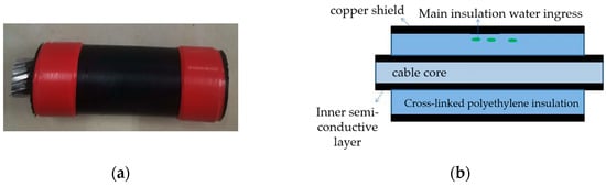 (a) Physical picture of water inlet defect on main cable insulation; (b) model of water inlet defect on main cable insulation.