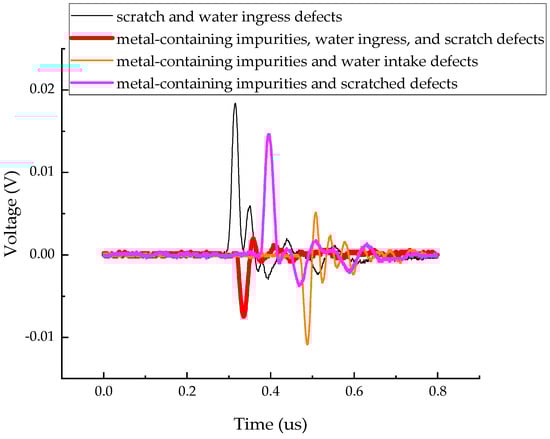 The measured partial discharge signals for four types of composite defects are shown in Figure 6.