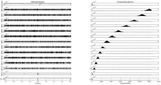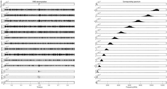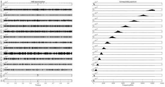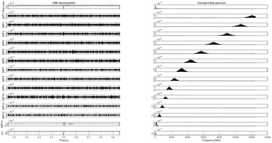 To find the differences in the partial discharge signals of the four types of composite defects, the differences are used for the pattern recognition of the partial discharge signals of the four types of composite defects. In this paper, 20 samples are randomly selected from the partial discharge signals of four types of composite defects collected from the partial discharge experiments for variational mode decomposition. Each raw partial discharge signal is decomposed into 13 modal components and a residual component. The VMD decompositions of each of the partial discharge signals of the four types of composite defects and their corresponding spectra are shown in Figure 7, Figure 8, Figure 9 and Figure 10.