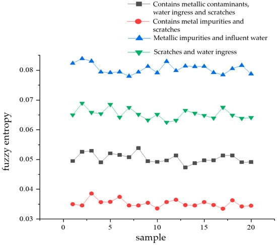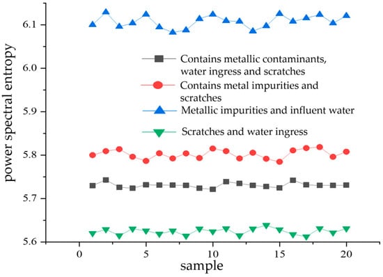 From Figure 11, it can be seen that the mean value of power spectral entropy of the partial discharge signals containing metal impurities and water intake defects is the greatest. Its value fluctuates around 6.1, indicating that among the four types of composite defects, the energy distribution of the partial discharge signals of metal-containing impurities and water-entry defects is the most complex in the frequency domain space. The lowest mean value of the power spectral entropy of partial discharge signals is obtained for scratch and water ingress defects. Its value fluctuates around 5.62, indicating that among the four types of composite defects, the partial discharge signals of scratch and water ingress defects have the lowest complexity of energy distribution in the frequency domain space.