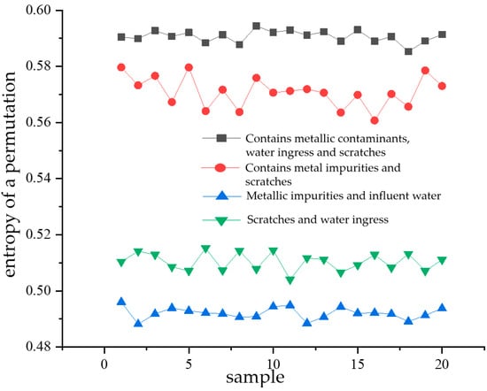 Permutation entropy, introduced by BANDT and POMPE, is used to quantify the degree of randomness in signal sequences. A smaller calculated permutation entropy value indicates that the signal sequence is more stable and regular, whereas a higher value suggests a stronger degree of randomness in the signal sequence [,]. Variational modal decomposition is performed for 20 randomly selected sample datapoints for each type of composite defect partial discharge signal, respectively. Then, the alignment entropy value of each modal component obtained from the decomposition is calculated, and then the average value of the alignment entropy of the 13 modal components of each partial discharge signal is obtained (PE). Shown in Figure 13 is a comparison of the mean PE of the entropy of each modal component alignment calculated from 20 samples of partial discharge signals for each of the four types of composite defects. From the figure, it can be seen that the average value of the entropy of the partial discharge signals of defects containing metal impurities, water ingress, and scratches is the largest, indicating that the randomness of the partial discharge signals of this type of defect is the strongest. The mean entropy value of the arrangement of the partial discharge signals of metal-containing impurities and water intake defects is the smallest, and its value fluctuates around 0.49. It indicates that among the four types of composite defects in cables, the partial discharge signal sequence of defects containing metallic impurities and water ingress is the smoothest and most regular. Since there is a significant difference in the magnitude of the average value of the arrangement entropy (PE) of the partial discharge signals of the four types of composite defects, the average value of the arrangement entropy (PE) can be used as an eigenvalue for the pattern recognition of the partial discharge signals of the four types of composite defects.