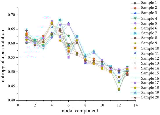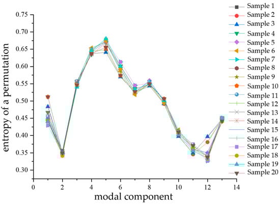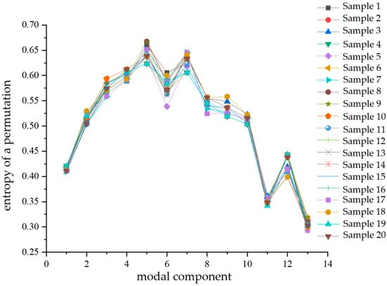 Fuzzy entropy characterizes the complexity of a time series; the simpler the time series, the smaller its fuzzy entropy value. Conversely, the more complex the series, the larger the fuzzy entropy value. Fuzzy entropy possesses a strong capability to resist interference from background noise [,,]. For each type of complex defect, 20 sample datapoints of partial discharge signals were randomly selected and subjected to VMD decomposition. Then, the fuzzy entropy values of the various modal components obtained from the decomposition were calculated, followed by determining the average fuzzy entropy FU of the 13 modal components for each signal. Figure 12 illustrates a comparative diagram of the mean fuzzy entropy values (FU) for each modal component, computed from the 20 partial discharge signal samples of the four types of complex defects.