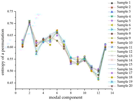 Similarly, after calculating the alignment entropy values of each modal component for a total of 80 samples of the four types of composite defects, a comparative analysis of the differences was performed with the modal components as the horizontal coordinates. The comparison diagrams are shown in Figure 14, Figure 15, Figure 16 and Figure 17. From the figures, it can be seen that there is a significant difference in the alignment entropy value Pe of the 2nd modal component IMF2 and the 13th modal component IMF13 for the four types of composite defects. The aligned entropy values of IMF2 for the four types of defects, scratches and water ingress; metal-containing contaminants and scratches; metal-containing contaminants and water ingress; and metal-containing contaminants, water ingress, and scratches, varied in the vicinity of 0.51, 0.6, 0.35, and 0.7, respectively. The value is the largest for defects containing metallic impurities, water ingress, and scratches, indicating that the IMF2 signal sequence of the partial discharge signals of such defects has the strongest randomness and the poorest regularity. This value is the smallest for IMF2 containing metal impurities and inlet defects partial discharge signals, indicating that the partial discharge signals of the IMF2 signal sequence containing metal impurities and inlet defect partial discharge signals has the weakest stochasticity, is the smoothest, and has the most regularity. The aligned entropy values of IMF13 for the four categories of defects, scratches, and water ingress; metal-containing contaminants and scratches; metal-containing contaminants and water ingress; and metal-containing contaminants, water ingress, and scratches, varied in the vicinity of 0.3, 0.5, 0.45, and 0.6, respectively. It indicates that among the four types of composite defects, the IMF13 signal sequence of partial discharge signals of defects containing metallic impurities, water ingress, and scratches has the strongest randomness and the worst regularity. The IMF13 signal sequence of partial discharge signals from scratches and water ingress defects has the weakest, smoothest, and most regular randomness. Since these two values vary in different value ranges, respectively, the arrangement entropy values (Pe) of IMF2 and IMF13 can be used as two eigenvalues for subsequent pattern recognition.
