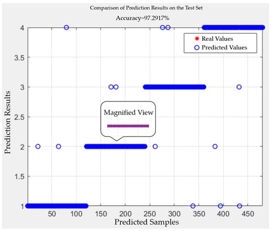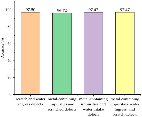 The pattern recognition of four types of complex defect partial discharge signals was conducted using SO-SVM, and the results are shown in Table 2. As can be seen from Table 2, the SO-SVM classifier successfully identified 117 samples with scratch and water ingress defects, 118 samples with metal impurity and scratch defects, 116 samples with metal impurity and water ingress defects, and 116 samples with metal impurities, water ingress, and scratch defects among the 480 test samples. In total, 467 samples were correctly identified out of 480, achieving an identification success rate of 97.29%. The accuracy comparison for identifying partial discharge signals of the four complex defect types is illustrated in Figure 18.