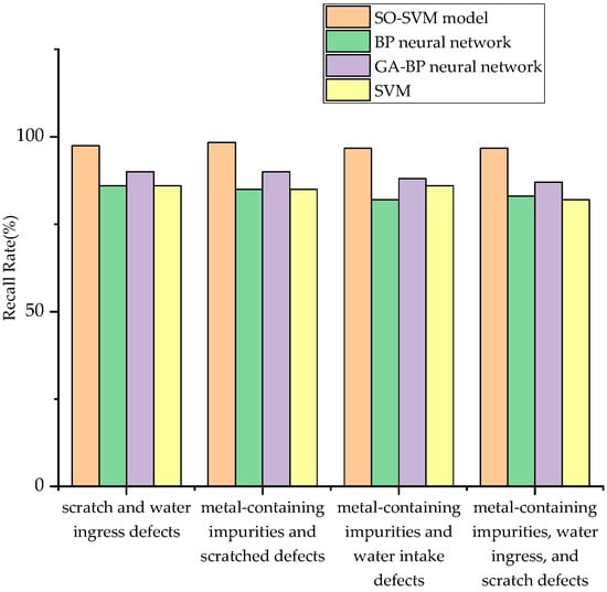 A comparison of the partial discharge signal recall of the four types of composite defects for various model classifiers is shown in Figure 21. From the figure, it can be visualized that the SO-SVM model has the highest recall for the partial discharge signals of the four types of composite defects, indicating that the method is the most accurate for the identification of sample data.