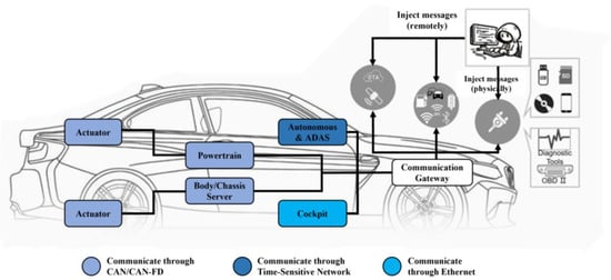 ECUs in vehicles widely use Controller Area Network (CAN)/Controller Area Network with Flexible Data (CAN-FD) Rate bus for communication. The original CAN/CAN-FD bus design does not adequately consider information security [], lacking sender verification and message authentication in its broadcasting mechanism, which makes in-vehicle networks vulnerable to tampering and injection attacks. As depicted in Figure 1, the increasing connectivity of modern vehicles with external devices [], such as through OBD-II ports [], USB ports, Wi-Fi, and Bluetooth, exacerbates this vulnerability [,]. Once network attackers gain access to the bus [], they can manipulate communication, including injecting anomalous frames that transmit various erroneous commands or data to targeted vehicle components. The prevalent types of abnormal messages include Denial of Service (DoS) [], Fuzzing [,], Replay [], Spoofing [], Scaling attack [,], and Ramp attack [,]. Researchers have explored the security issues of in-vehicle networks []. Koscher et al. [] are among the first to show how attackers gain complete control over vehicle functions by intercepting and reverse-engineering CAN bus data. This unauthorized access can disrupt critical automotive functions, like braking and steering, raising significant safety risks. It can also expose personal data such as vehicle movements and driving preferences. Through the analysis of the past ten years, it was found that in the most common automotive attack incidents, those directly or indirectly caused by the CAN/CAN-FD bus accounted for 13.61% of the total []. Therefore, enhancing the security of CAN/CAN-FD systems is essential to protecting in-vehicle networks from increasing cyber threats.