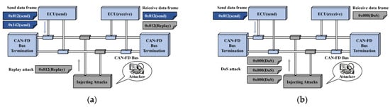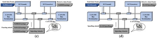 Spoofing: Attackers transmit entirely forged data frames to a target node, aiming to mimic legitimate data or commands from a real source in the network bus []. By simulating authentic ECU communication with these forged CAN-FD messages and altering their control and data fields, attackers deceive other ECUs or the vehicle control system. This can lead to data deviations in ECUs, resulting in loss of vehicle control, execution of unintended operations, or system chaos, ultimately leading to in-vehicle malfunction [].