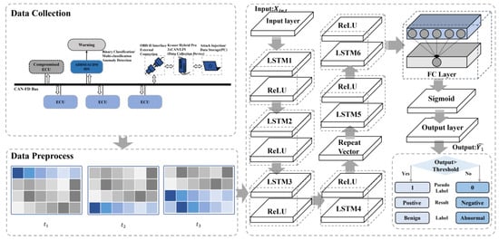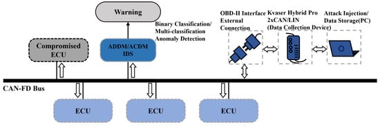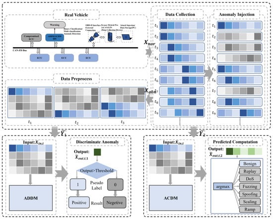 As depicted in Figure 4, this work begins with the collection of data from the real vehicle. Subsequently, anomalies are injected into the collected dataset. This is followed by a preprocessing phase. The final step involves using ADDM for binary classification to distinguish between normal and abnormal frames and to identify anomalies. Alternatively, ACDM is used for multiclass classification to facilitate prediction calculations and to ascertain the category of the frames.
