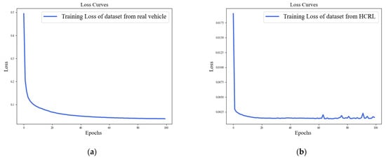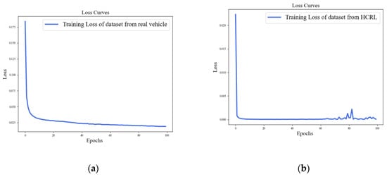 Training loss of the ACDM model on the datasets from a real vehicle and HCRL: (a) dataset from an actual real vehicle; (b) dataset from HCRL.