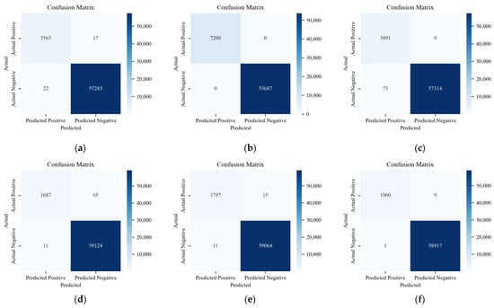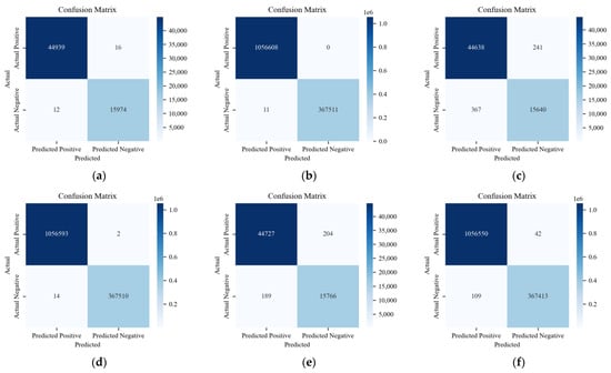 The six figures are the classification results of HyDL-IDS trained on the dataset from the actual vehicle: (a) confusion matrix about Replay; (b) confusion matrix about DoS; (c) confusion matrix about Fuzzing; (d) confusion matrix about Spoofing; (e) confusion matrix about Scaling attack; and (f) confusion matrix about Ramp attack.