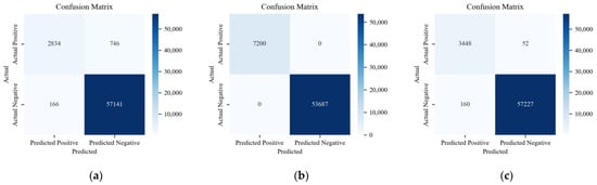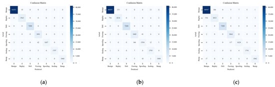 Confusion matrix for the model trained on the dataset from an actual vehicle: (a) ACDM; (b) LSTM-based model; and (c) HyDL-IDS.