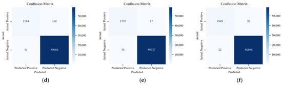 Figure 12 displays the result of multi-classification with the labels in subplots (a), (b), and (c), which correspond to different types of CAN-FD frame data. Those express the quantitative relationship between the predicted and actual class labels. It can be seen that the performance of the ACDM model is superior to the LSTM-based model and HyDL-IDS for correctly classified positive samples.