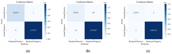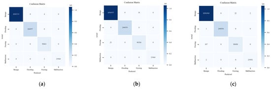 The classification results of HyDL-IDS trained on the dataset from HCRL: (a) confusion matrix about Flooding; (b) confusion matrix about Fuzzing; and (c) confusion matrix about Malfunction.