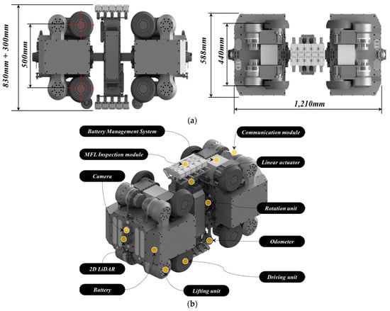 Overview of composition for in-pipe inspection robot. (a) Detail dimension of in-pipe inspection robot. (b) Configurations of in-pipe inspection robot.