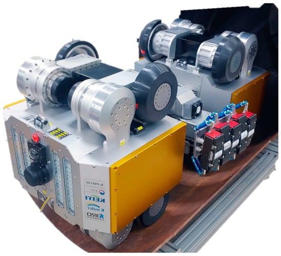 Following the detailed design phase, a prototype of the in-pipe inspection robot was constructed. The final weight of the robot, inclusive of the battery, was recorded at 280 kg, demonstrating the feasibility of the design. Figure 4 illustrates the developed in-pipe inspection robot, highlighting its physical configuration.