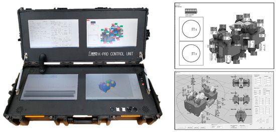 To facilitate the field test of the developed pipe inspection robot, a Robot Operating System (ROS) was designed. The ROS was designed in a compact form factor to enable easy portability, considering its application in various field environments. Encased within dimensions of 1000 mm (L) × 448 mm (W) × 169 mm (H), the ROS system incorporates four 17-inch touchscreen monitors. Each of these monitors is dedicated to specific functionalities: robot control GUI, robot posture verification monitoring system, robot status monitoring system, and pipe traversal status monitoring system. The ROS system and the robot itself are configured to communicate wirelessly with each other. Figure 5 shows the developed ROS with the GUI environment applied to the ROS depicted on the right side.