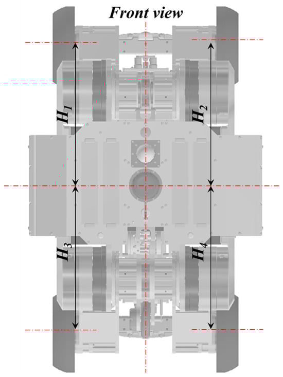 Here, HPID represents the output of the PID control to make the roll angle zero. H1, H2, H3, H4 are the heights of each wheel lift module when viewed from the front of the robot, as shown in the figure. This control algorithm is applied to both the front and rear drive modules, similar to pitch control.