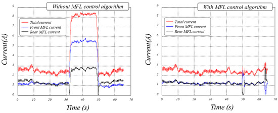 To validate the proposed MFL rotation module control algorithm, external forces were applied to the wheel drive units while operating the MFL rotation module. Without the proposed algorithm, it was observed that an increase in current occurs due to the angular difference between the two drive motors applied to the MFL rotation module. However, when the proposed algorithm is applied, it can be noted that the speed of the MFL rotation module adapts immediately to external forces, minimizing the current while maintaining the desired speed. Figure 8 shows the test results of the proposed algorithm for controlling the MFL rotation module.