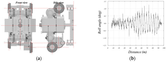 Figure 10b shows the pitch variation of the robot when moving approximately 100 m inside the pipe using the method. The absolute pitch angle of the robot was measured by the IMU inside of the robot. As observed in the figure, the pitch variation occurring during the robot’s traversal was maintained to within 0.1 degrees. Here, HFd represents the height of the upper lifting unit at the front, HFc represents the height of the lower lifting unit at the front, HRd represents the height of the upper lifting unit at the rear, and HRc represents the height of the lower lifting unit at the rear.