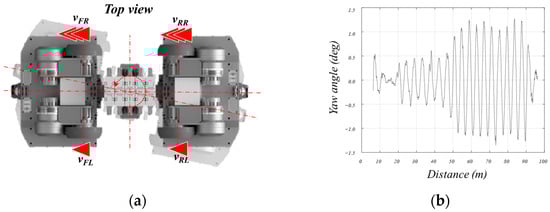 Yaw control is a crucial element for the robot to move forward along the pipeline’s interior. Initially, the distances on the left and right sides of the robot are measured using the lidar in the front. Yaw control should minimize this distance difference. The yaw control is implemented using the skid-steering method, which utilizes the speed difference between the two wheels as shown in Figure 12a to control the orientation of the robot.