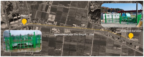 The field test of the in-pipe inspection robot was conducted at a field test bed located in Gunsan, Korea. The pipeline spanned approximately 1 km, featuring diverse configurations of curves and gradients. The field test bed for the in-pipe inspection robot driving test is buried at a depth of 6 m underground. With detailed information lacking about the buried pipeline, the aim was to acquire detailed information as part of the robot’s driving test. Figure 14 shows the overview of the field test bed location and layout.