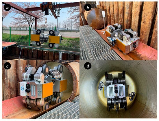 Before the field test of the in-pipe inspection robot we developed, a pilot test was performed in the laboratory. The pilot test bed was designed to simulate conditions similar to those of large-diameter buried pipes. The pilot test bed comprised sections including a horizontal 45-degree mitered pipe and a sloped section with a 22.5-degree incline. The pipes constituting the pilot test bed were sized with diameters ranging from 900 mm to 1200 mm. Through the pilot test bed tests, it was ensured that the developed pipe inspection robot would be operable in real-world environments. According to the pilot test bed tests, it was confirmed that the design maximum speed of the in-pipe inspection robot, set at 300 mm/s, was achievable. Based on driving tests on the pilot test bed, it is inferred that the developed in-pipe inspection robot will be capable of operating in actual pipelines with various forms of curvature. Figure 13 shows the configurations of the pilot test bed located at Deajeon, Korea.