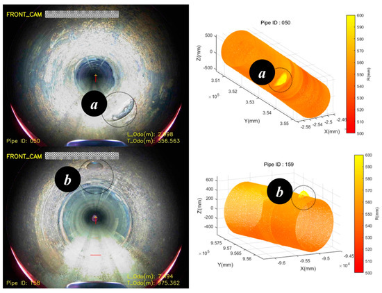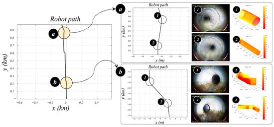 Throughout the driving tests conducted on the field test bed, the LiDAR located at the front and rear center of the robot was utilized to assess the condition of the pipe, detect obstacles, and determine the relative positions of the robot and the pipe. By employing LiDAR on the robot, the distance between the robot and the center of the pipe was calculated, and the lifting arm and driving wheels were controlled to ensure that the robot remained positioned at the center of the pipe during navigation. The point cloud data obtained through LiDAR can be transformed into a three-dimensional graphic with the pipe center as the reference coordinate system, allowing visualization of the pipe’s internal condition. Figure 16 shows the path followed by the robot while navigating the entire length of the actual pipe on the field test bed. The total length of the pipe was approximately 980 m, calculated using the odometer mounted on the robot’s underside. The curvature inside the pipe was determined using a combination of signals from the IMU sensor and the odometer mounted on the robot. Figure 16a,b depict the shapes of the curves present in the pipe on the field test bed. The condition of the pipe can be observed using the camera mounted on the robot, as shown in Figure 16(a1,b1), while the overall shape of the pipe can be determined using LiDAR, as shown in Figure 16(a2,b2).