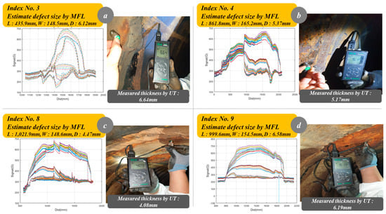 Among the 10 detected defects, the 4 sections requiring repair and replacement were re-measured using ultrasonic test equipment (Dakota, CA, USA, ZX-6). The inspection results from the ultrasonic test equipment confirmed a maximum error of 8.72% compared to the MFL inspection results.