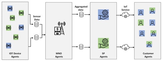 - Customer agents (): Representing the end users and consumers of IoT services, these agents interact with SPs to access and utilize the offerings provided by the ecosystem.