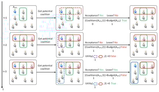 - Time step : Coalition change because of positive utility and budget constraint saturation. In the third time step, receives another coalition proposal with three other members. After evaluating the utility, determines that joining the new coalition and leaving the current one would yield a greater utility value. Consequently, accepts the offer, leaves the previous coalition, and joins the new one. This scenario demonstrates the case where the agent maximizes its utility by switching coalitions.