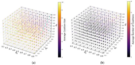 The size and number of coalitions within the MA-DCF exhibit sensitivity to variations in threshold values , , and . In our experimental setup, these thresholds are set within the range of 0.1 to 0.9 to elucidate their impact. Lower threshold values relax compatibility constraints, resulting in fewer but larger coalitions, as SP agents find it easier to meet the relaxed compatibility criteria. Conversely, higher threshold values impose stricter compatibility requirements, leading to the formation of many smaller and more exclusive coalitions. This nuanced relationship is illustrated in Figure 3a, showing how different combinations of threshold values correspond to varying average coalition sizes, and Figure 3b, which depicts the corresponding number of coalitions formed. Therefore, the precise calibration of threshold values is essential for shaping both the size and number of coalitions within the IoT ecosystem, ensuring that formed coalitions effectively leverage synergies and resources while maintaining compatibility among participating agents.