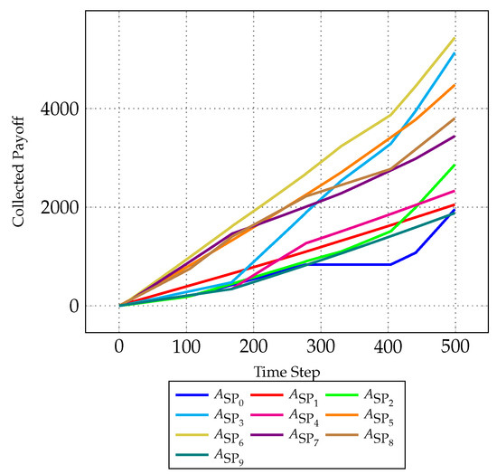 The payoff trajectory of each SP is depicted with a distinct line plot, enabling a granular analysis of their performance dynamics. The x-axis delineates time progression, offering a temporal context for assessing SP behavior, while the y-axis quantifies accumulated payoffs, reflecting the efficacy of coalition formations and strategic decisions.