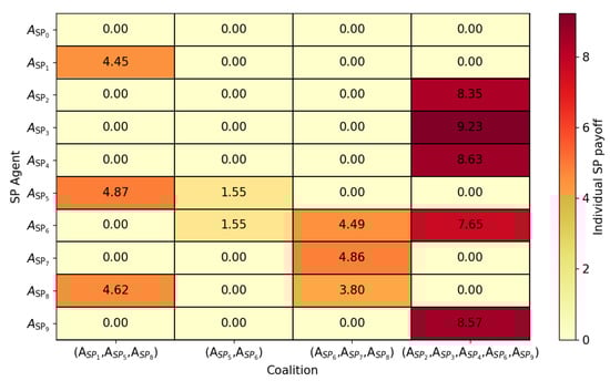 Figure 5 sheds light on the individual payoffs attained by each SP agent through participation in dynamic coalitions at a specific time step. By visually mapping the distribution of payoffs across different SP agents and coalition configurations, valuable insights can be gleaned regarding the efficacy of coalition formations. Additionally, it offers insights into the equitable distribution of payoffs among SP agents, facilitating the design of fair and sustainable coalition structures. Consider the analysis focused on the last coalition . Here, SP agent emerges as the primary beneficiary, garnering the highest payoff due to its substantial contributions to the coalition’s objectives. Conversely, SP agent receives a notably lower payoff, underscoring variations in engagement levels and contributions among coalition members. It is worth noting that non-member SP agents receive a payoff of 0.0, indicative of their exclusion from coalition activities.