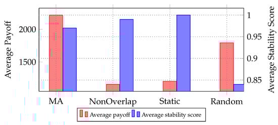 Figure 7 further delves into the comparison between the four coalition formation strategies, providing a deeper analysis of their performance and stability. This detailed analysis is derived from a comprehensive simulation comprising 10 runs, each spanning 100 time steps. The average payoff, depicted on the left y-axis, represents the payoff (refer to Equation (11)) amassed by coalitions formed using each approach after 100 time steps, averaged across the 10 runs. It can be calculated as: