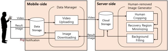Mobile-side: The mobile-side component is mainly responsible for interacting with a user. A short video of about 5 s is acquired from the user and stored in the system’s internal storage. When the user requests to process human removal, the Data Manager sends the videos to the server side. After human removal is completed on the server side, the Data Manager receives a resulting image. After the image downloading is complete, the Data Manager stores the image in the storage and notifies the user that the processing is complete so that he/she can view the result.