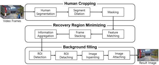 We develop a multi-frame-based recovery region minimization method to address the issues above. It expands and crops the regions of the identified humans through image segmentation on multiple frames, which can be obtained from a few seconds of video. Information from these frames is aggregated to obtain actual scenes and achieve more natural results. However, in some cases, such as when there is minimal movement of people within a video, cropped regions identified in the initial step may remain. In this case, these regions are designated as Regions of Interest (ROIs), and image inpainting is performed only for these areas rather than processing the entire image.