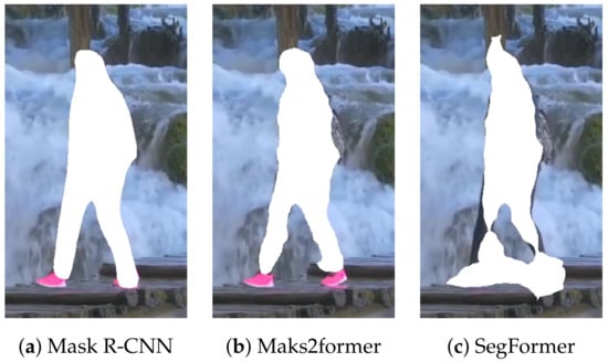 It is necessary to determine where humans are located within an image to remove humans from the image. A straightforward approach is to use image segmentation methods. However, simply applying them could result in imprecise identification of the human regions, negatively impacting the quality of the resulting image. Figure 3 shows human cropping examples using several widely used image segmentation techniques such as Mask R-CNN [], Mask2former [], SegFormer []. It can be seen that some parts of the humans, such as legs and shoes, are not accurately segmented. These parts remain even after the humans are removed and the segmented regions are restored (see Figure 4). Users are highly likely to consider such a result quite unnatural, which degrades the user’s satisfaction.