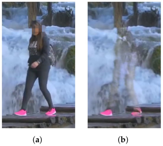 Human removal without dilation (Images were captured on Touropia (https://www.youtube.com/@touropia), accessed on 14 April 2024). (a) Before human removal. (b) After Human removal.