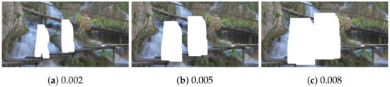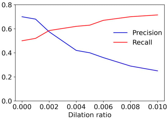 In this work, an appropriate dilation ratio is determined empirically. It is examined how different ratios affect final segmentation results for this purpose. The pre-trained Mask R-CNN model is used for the initial segmentation before dilation. Figure 6 shows the average recall and precision with different dilation ratios. As the ratio increases, false negatives, i.e., the area that is not segmented even though it belongs to human regions, decrease, thereby increasing the recall. However, false positives also increase, which may negatively impact the image quality. Increasing false positives decreases the precision. For balanced performance, the dilation ratio is set to 0.002.