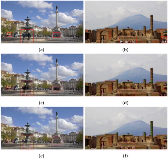 The masked areas should be filled in as the next step of human cropping. The straightforward approach is to recover these areas using image inpainting techniques. However, simply employing these techniques poses some problems. Figure 7 shows the results of removed human area restoration with image inpainting techniques such as EdgeConnect [] and MAT []. In comparison to the original images (Figure 7a,b, we can see unnatural areas where there are people as shown in the red boxes in Figure 7c–f. The problem could occur when the areas to be restored have complex patterns or are positioned at the edges of the scene, where there may be limited reference information available.