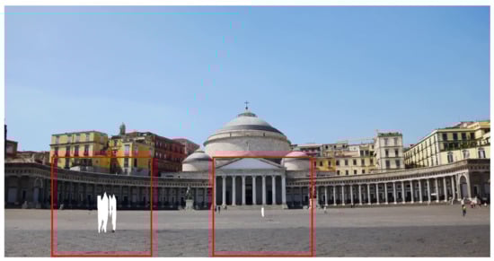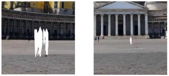 For evaluation, 20 videos were collected, which were 3–5 s long; some were recorded by researchers (e.g., Figure 11a) and the others were downloaded from Touropia Youtube channel (https://www.youtube.com/@touropia, accessed on 14 April 2024) (e.g., Figure 11b). We specifically target the case when an input video contains a moderate number of people showing natural movement in a real-world scenario. We carefully considered several factors in preparing the input data workload to ensure the validity and generalizability of the experimental results. Firstly, the videos recorded by researchers were captured in authentic outdoor settings on a university campus, reflecting people’s natural behavior. It ensures that our data accurately represents real-world conditions and behaviors. Secondly, to expand the scope of our evaluation, we carefully selected videos from YouTube featuring people moving naturally in diverse famous locations. Specifically, we selected videos where people were moderately active, as videos with no people moving would not significantly differ from simple image inpainting. Additionally, we excluded videos with excessive crowds obstructing landmark visibility. The videos were divided into two cases to measure the performance with the proportion of the human part in a frame. Based on our observation of the videos, a threshold for the ratio of human regions is set to 2%. If it is less than the threshold, we consider it the small case and the others (more than 2%) the large one.