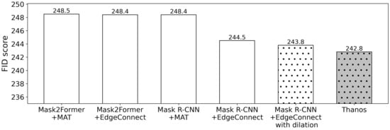 White color bars in Figure 12 present the FID score measurements for several baseline methods (i.e., Single frame without dilation) that merely utilize combinations of image segmentation models such as Mask R-CNN [] or Mask2Former [] and image inpainting models such as EdgeConnect [] or MAT [], including both CNN and GAN-based earlier models and transformer-based recent models. Note, that we considered these models as candidates for integration into Thanos to assess our proposed pipeline performance. Our objective was to investigate how various models with their respective strengths and weaknesses would impact the performance within our pipeline. The result demonstrates that the combination of Mask R-CNN and EdgeConnect shows better image quality than other alternatives. Thus, Thanos’ processing pipeline adopts them and applies the proposed techniques, i.e., segment dilation and frame stacking, to minimize the recovery region.