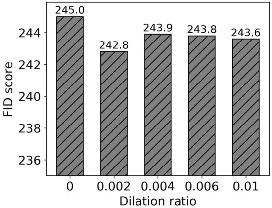 Figure 13 shows the FID scores depending on the dilation ratio. The FID score is the smallest when it is 0.002. It increases again and then gets saturated as the ratio gets greater. Generally, performance is better when segment dilation is applied than when it is not. In some cases, human parts such as fingertips and shoes remained even after human segmentation without segment dilation. These parts degrade image quality. As mentioned above, if the dilation ratio is too small, the human area is not adequately segmented, resulting in decreased image quality. On the contrary, if it is too large, the quality decreases because more segmented regions need to be recovered. Setting an appropriate ratio (0.002 in this paper) is essential for the quality of generated images.