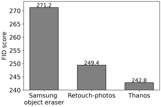 It is shown that Thanos outperforms alternative methods regarding image quality with comparable processing latency. Furthermore, compared to the alternatives, the lowest FID [] scores are achieved by the proposed method. It is also shown that Thanos generates more natural human-removed images regarding FID scores compared to two existing applications, Retouch-Photos and Samsung object eraser. The FID scores for Thanos, Retouch-Photos, and Samsung object eraser are 242.8, 249.4, and 271.2, respectively.