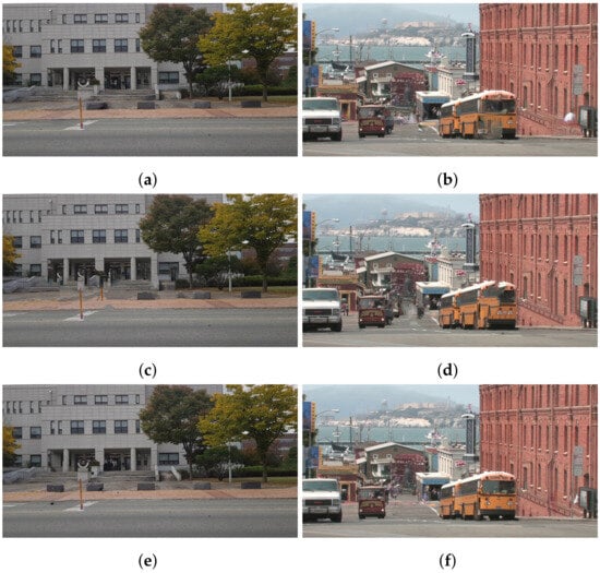 Figure 14 shows the FID score of Thanos is lower than alternatives. It means Thanos generates more natural human-removed images than Samsung object eraser and Retouch-photos. Such apps restore the user-specified areas in a single image. In some cases, the quality of restored regions may not be good enough. For example, if the area to be recovered involves a complex pattern, such as a building in Figure 11a and a yellow bus in Figure 11b, it is not restored correctly, as shown in Figure 15a–d. On the other hand, Thanos utilizes multiple frames, and thus, it is likely to acquire information about some occluded areas in a frame from the subsequent frames. Accordingly, Thanos reduces the size to restore and generates better-quality images, as shown in Figure 15e,f.