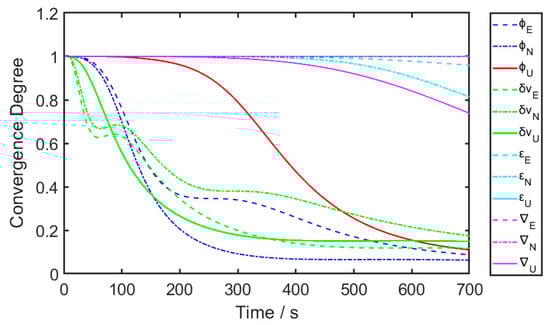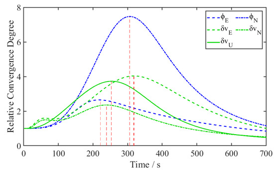 The fine alignment aims at converging the azimuth misalignment, and therefore, it is necessary to focus on the convergence degree of each state relative to the azimuth misalignment . Using the same data as in Figure 2, we plotted the relative convergence degree of each strong observable state to the azimuth misalignment in Figure 4, in which the peak of appears the latest. According to observability theory, strong observable states should have converged at this time point, whereas the azimuth misalignment has not yet fully converged, not to mention those remaining states with even lower observability or that are unobservable. We selected the states that have not yet achieved full convergence and the unobservable ones as target states for applying a lower-bound constraint. Once the final peak of strong observable states is identified, the variances in the target states are restrained to the values at this specific moment for subsequent Kalman filter processing.