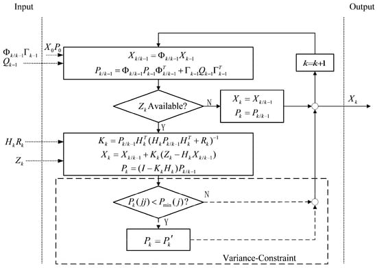 As illustrated, the primary difference between the VCKF and the classic KF is that once the main diagonal element is smaller than its lower limit , then it is replaced by its lower limit .