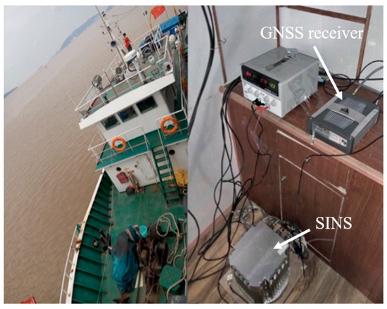 In this section, we conduct tests using actual shipborne data and in a dynamic sea environment. Three groups of tests were performed to verify the performance of our proposed method in initial alignment under different sea and swaying conditions. The experiment environment and devices are illustrated in Figure 5. We utilized a high-precision ring laser gyros SINS with gyro drift better than 0.005°/h and accelerometer stability better than 10 μg. The SINS sampling rate was set at 200 Hz.