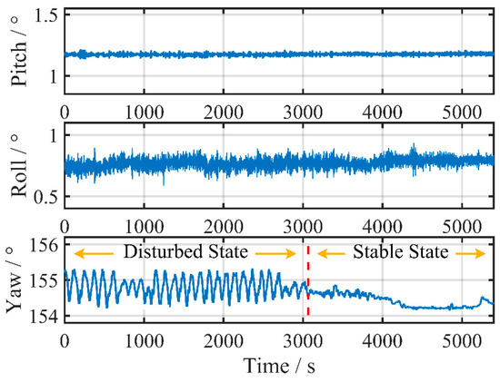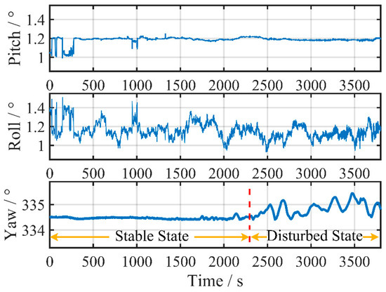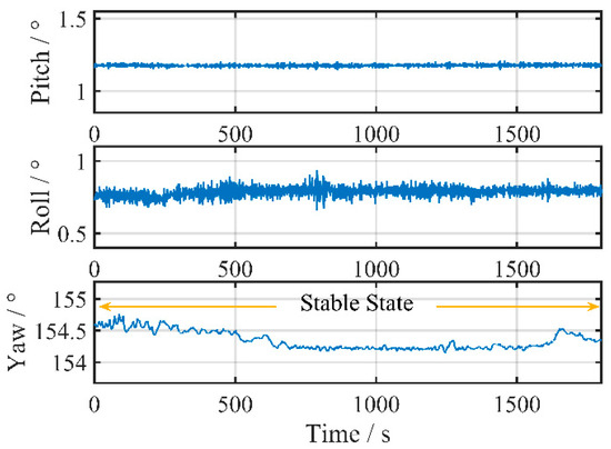 The angular motion caused by disturbances in the ocean and other external factors was observed by the gyroscope and reflected in the change in attitude. Therefore, the alignment environment during initial alignment can be indirectly described by the change in vessel attitude. Figure 6 illustrates the changes in vessel attitude, which appear relatively stable without prominent periodic disturbances during this set of tests.